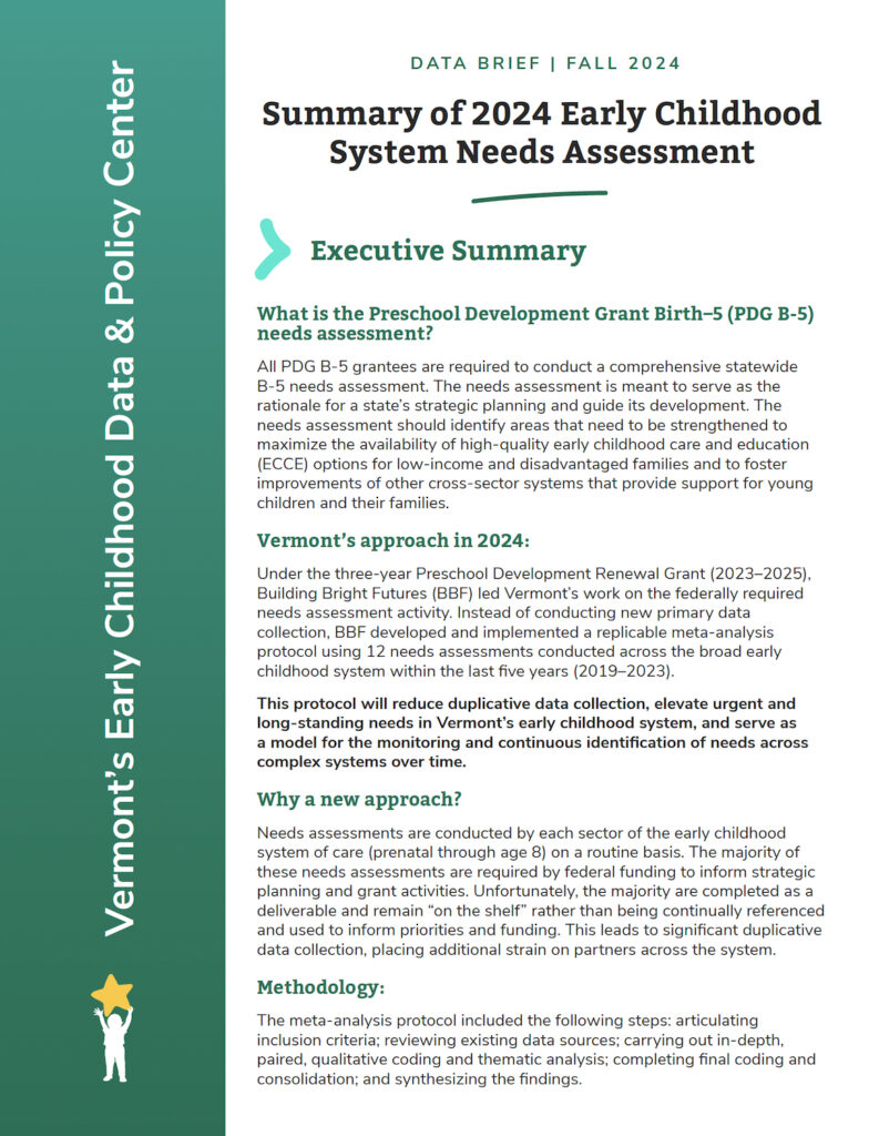 December 18, 2024 2024 Early Childhood Systems Needs Assessment Building Bright Futures (BBF) led Vermont’s work on the federally required needs assessment activity under the Preschool Development Grant. Instead of ... Read More